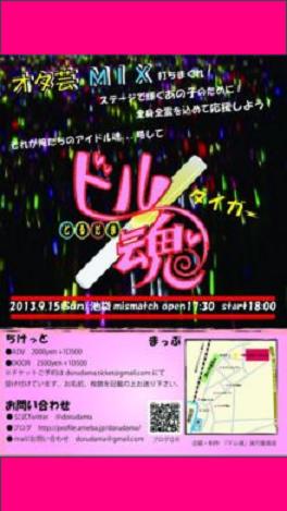 What's ドル魂? ☆゚・*「*・゚゚・。・゚゚・。・゚゚・☆ ・。。・゚・。。・゚・。。・*「*・。☆ 慣れないステージ、ダンス、歌。 必死で頑張っている彼女の力になりたい。 きっかけはそんな想いだった――― ☆◇☆◇☆◇☆◇☆◇☆ サイリウムを振り乱すも良し、ヲタ芸を打つも良し。 ステージで輝くあの子のため、全身全霊で、 熱く、熱く、もっと熱く、あの子を応援したい!!! それが、俺たちの「アイドル魂」、 略して 『ドル魂(どるだま)』!!! そんなドル魂を持った方々に楽しんでもらうための イベントを企画しております。 ヲタ芸、MIX大歓迎 打って騒いで盛り上がろう! あなたのご来場、お待ちしています! 「ドル魂」タイガー! Live : Sugar☆DreamIN(アイドル)/風見 萌(ボカロ)/幸咲まい(アイドル) 山崎萌(アニソン)/篭重ありさ(アニソン)/デカシャツ喫茶(アイドル)/ Magical❤Honey(アニソン)/ +more... ■9/21(sat)
