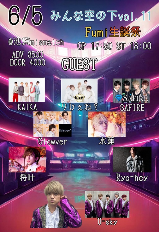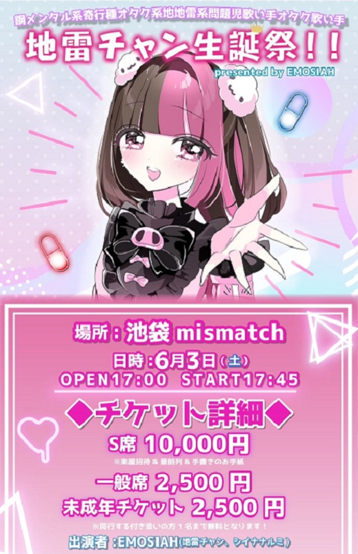 【ZiL-【不】-定期GiG 『死立ZiL学園〜ちょっぴり早めの夏祭〜』】 ![]() open18:00/start18:30/ グッズ&特典付優先チケット(Z):5,000円(D別600円) 特典付チケット(i):2,500円(D別600円) 通常チケット(L):1,000円(D別600円) 当日券(C):1,500円(D別600円)*未定 LIVE⇒ ZiL / 【地雷ちゃん生誕祭!!】 ![]() open17:00/start17:45/ S席:10,000円/一般席: 2,500円/ 未成年チケット2,500円/ (各1ドリンク別600円) LIVE⇒ 地雷ちゃん / LIVE⇒ ZiL / 【みんな空の下vol.11】 ![]() open 17:50/start18:00/ 前売:3,500円/当日:4,000円 (1ドリンク別 600円) 出演 ⇒ U-sky /KAIKA /りじぇね? /Ryo-hey / 水蓮 /SAFIRE /Glowver /将和 / 【NATURAL MOVEMENTZ PRESENTS Deep House Party SAMURAI GARAGE】 open&Start 18:00 チケット:3,000円/ With flyer :2,600円 (1ドリンク込) Djs ⇒ deepermak /DJ KAZ(Project301) /KENTA MORi / TAKUYA KATAGIRI(GASOLINE) / Spritual dance session ⇒ KANGO /NUE /NAOKI / YU-YA /HIRO /MAK /MUKAI /NITTY /SHOUJI / Guet dance show case ⇒ Suu+iwa+JP /NAO+Saki / |