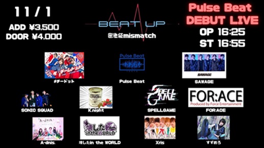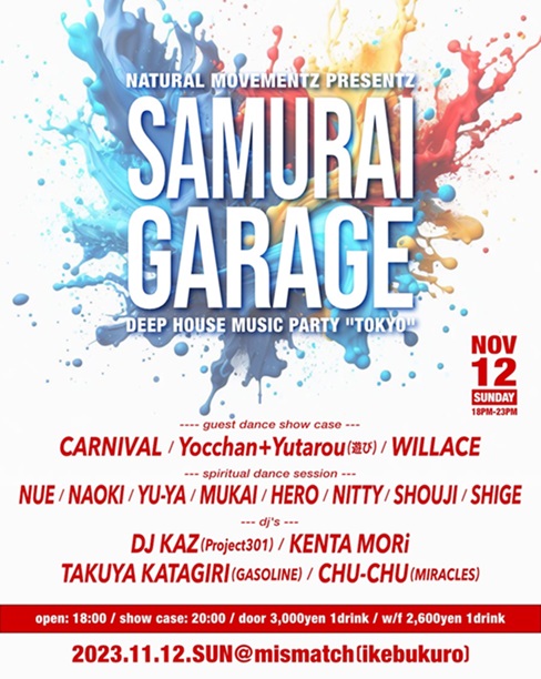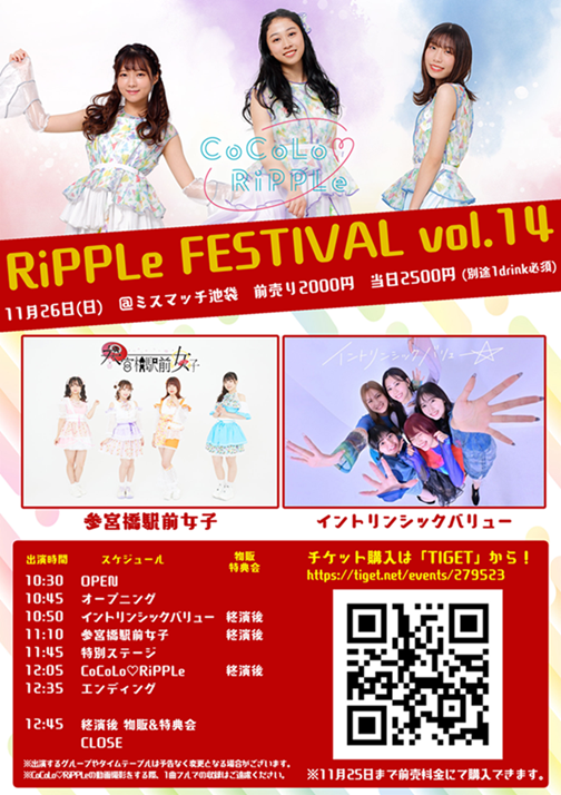 【Pulse Beat DEBUT LIVE BEAT UP】 ![]() open 16:25/start16:55/ 前売:3,500円/当日:4,000円 (1ドリンク別 600円) 出演 ⇒ Pulse Beat /FOR:ACE /SAWAGE /すずめろ / #チードット /SONIC SQUAD /K.night / SPELLGAME /A-dis. /壊したin the WORLD / 【ピピア × バイシュバ共催! アイドル紅白歌合戦】 ![]() open 18:00/start18:30/ 前売:2,500円/当日:3,000円 最前エリア:3,500円 全て(1ドリンク別 600円) 出演 ⇒ pipia(白組主催) /ByteSchwarz(紅組主催)/ ゼロサンクチュアリ(白組ゲスト)/THE+BETH(紅組ゲスト) / 【DEEP HOUSE MUSIC PARTY SAMURAI GARAGE 14】 ![]() open&start 18:00/ チケット:3,000円/ (1ドリンク別) Dj's ⇒ Dj KAZ /KENTA MORI /TAKUYA MORI / CHU-CHU / Guest dance show case ⇒ CARNIVAL / Yocchan+Yutarou /WILLACE / spiritual dance session ⇒ NUE /NAOKI / YU-YA /MUKAI /HERO /NITTY /SHOUJI /SHIGE / 【すずめろ1st anniversary『belief』】 ![]() open 18:00/start18:30/ 前売:3,500円 /当日:4,000円 / (1ドリンク別 600円) 出演 ⇒ すずめろ、スズノハヤト / 朝の部 【RiPPLe FESTIVAL vol.14】 ![]()
