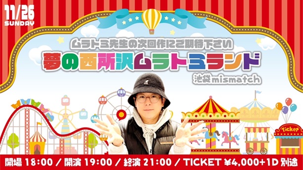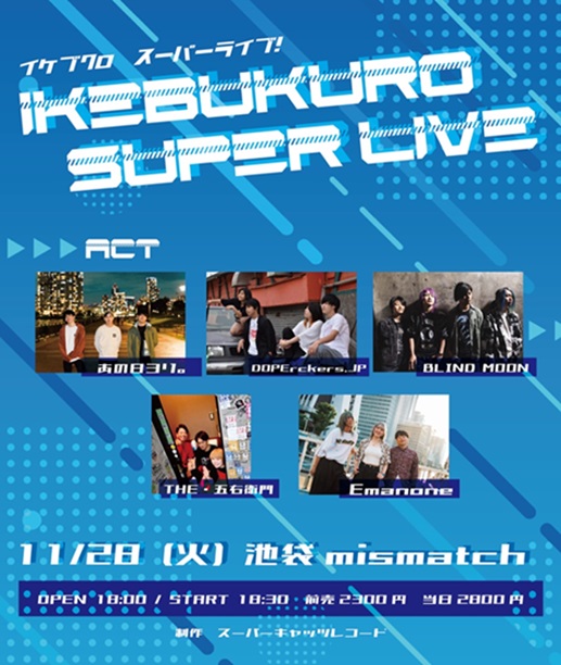 朝の部 open 10:30/start10:45/ 前売:2,500円/当日: 3,500円 (1ドリンク別 600円) 出演 ⇒ CoCoLo RiPPLe /参宮橋駅前女子 / イントリンシックバリュー / 夜の部 【ムラトミ先生の次回作にご期待ください 夢の西所沢ムラトミランド】 ![]() チケット:4,000円/ (1ドリンク別 600円) 出演 ⇒ ムラトミ先生 / 【IKEBUKURO SUPER LIVE】 ![]() open 18:00/start18:30/ 前売:2,300円/当日:2,800円 全て(1ドリンク別 600円) 出演 ⇒ THE・五右衛門 /BLIND MOON /Emanone / DOPErockers.jp /あの日ヨリ / |