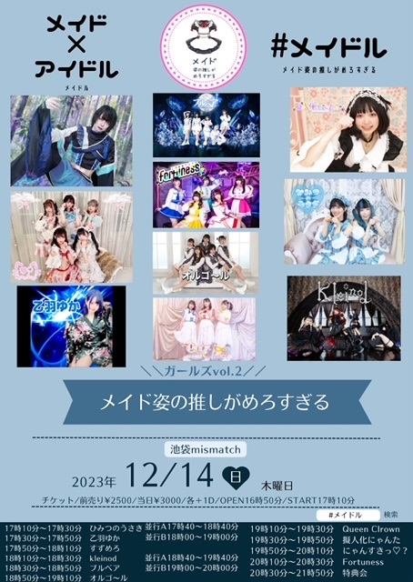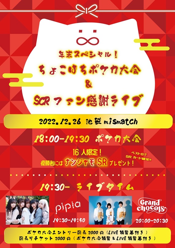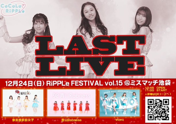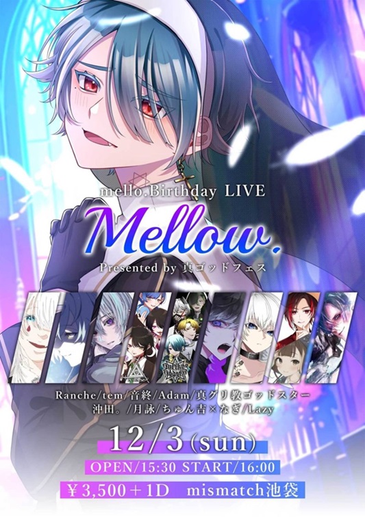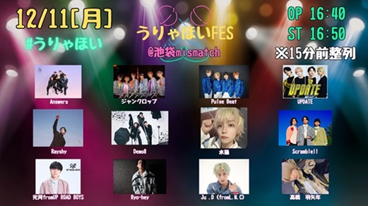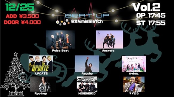 【mello Birthday LIVE Mellow】 ![]() open 15:30/start16:00/ 前売:3,500円/ (1ドリンク別 600円) 出演 ⇒ 真グリ教ゴッドスター /Adam /沖田。 / ちゅん吉 x なぎ /月詠 /tem /音終 /Ranche / Lazy / 【うりゃほいFes】 ![]() open 16:40/start16:50/ 前売:3,500円/当日:4,000円 (1ドリンク別 600円) 出演 ⇒ Pulse Beat /ジャンクロップ /高橋羽矢年 / UPDATE /Answers /Rayshy /水連 /Scramble!! /Demo8 / 光河from UP ROAD BOYS /Ryo-hey /Ju.D(from L.n.c) / 【メイド姿の推しがめろすぎる】 ![]() open 16:50/start17:10/ 前売:3,000円 /当日:3,500円 / (1ドリンク別 600円) 出演 ⇒ すずめろ /Fortuness /にゃんすきっ? / 擬人化にゃんた /Queen Clrown /オルゴ〜ル / ブルベア /kleinod /乙羽ゆか /秘密のうさぎ / 【負け犬るゐ pipia First Anniversary】 ![]() open 18:30/start19:00/ 前売:2,500円 / 前方エリア特典付き:5,000円 / 前方エリア:3,500円 ※当日は全て500円プラス (1ドリンク別 600円) 出演 ⇒ pipia /Lって何のLですか? / しの(pipia) /他 <【RiPPLe FESTIVAL vol.15 クリスマススペシャル】 ![]() open 10:45/start11:00/ 一般前売:2,000円/一般当日: 2,500円 前方前売 :5,000円/前方当日:6,000円 (1ドリンク別 600円) 出演 ⇒ CoCoLo RiPPLe /参宮橋駅前女子 / 青山Rabness /wqwq / 【BEAT UP 〜Pulse Beat 新メンバー加入 クリスマススペシャル〜】 ![]() open 17:45/start17:55/ 前売:3,500円/当日:4,000円 (1ドリンク別 600円) 出演 ⇒ Pulse Beat /Rayshy /Ryo-hey / UPDATE /Answers / すずめろ /H!GENERIC / A-dnis. / 【ちょこはちポケカ大会 & SCRファン感謝ライブ】 ![]() open 17:30/start18:00/ 前売:2,000円 / ※当日は全て500円プラス (1ドリンク別 600円) 出演 ⇒ grand chocol8 / |