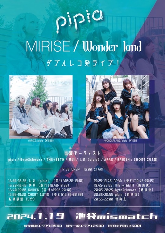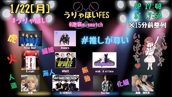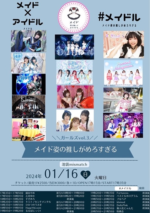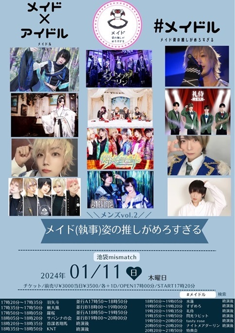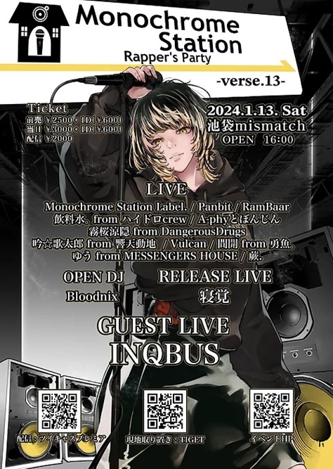 【メイド(執事)姿の推しがめろすぎる】 ![]() open 17:00/start17:20/ 前売:3,000円 /当日:3,500円 / (1ドリンク別 600円) 再入場時ワンドリンク600円 出演 ⇒ すずめろ /羽矢年 /ナイトメアダーリン / 楸大凰 /tasty rose / 閃光ラビット /礼侍 / 水蓮 /KNT /首謀者翔馬 /サバンナの会 /羅桜 / 【Monochrome Station -Rapper’s Party- verse.13】 ![]() open&startstart16:00/ 前売:3,000円/当日:3,500円 (1ドリンク別 600円) RELEASE LIVE :寝覚 / Guest Live :INQBUS / Live : ⇒ Monochrome Station Label. /Panbit /RamBaar / 吟☆歌太郎from響天動地 /Vulcan /飲料水。ハイドロcrew / 霧桜涼隠 from DangerousDrug /A-phyとぼんじん / 蕨. / 間開 from 勇魚。/ゆう from MESSENGERS HOUSE / OPDJ :Bloodnix / 【メイド姿の推しがめろすぎる(ガールズ)vol.3 -Rapper’s Party- verse.13】 ![]() open 17:15/start17:35/ 前売:2,500円 /当日:3,000円 / (1ドリンク別 600円) 再入場時ワンドリンク600円 出演 ⇒ すずめろ /Fortuness /DollyPink / 擬人化にゃんた /パステルホログラム /るるぱにっく!! / ブルベア /kleinod /乙羽ゆか /秘密のうさぎ /HappY bLoom / キミトノセンチメンタル /緑あやめ / 【pipia MIRISE/WONDERLAND ダブルレコ発ライブ!】 ![]() open 17:30/start18:00/ 前売:2,500円 / 前売最前エリア:3,500円 ※当日は全て500円プラス (1ドリンク別 600円) 出演 ⇒ pipia /ByteSchwarz /THE + BETH /夢月 / しの(pipia)/APAD /RAIDEN /SHORT CUT部 / 【うりゃほいFES】 ![]() open 17:40/start17:50/ 前売:3,500円/当日:4,000円 再入場:900円 (1ドリンク別 600円) 出演 ⇒ Pulse Beat / /AnsWers /k.night / 橋 羽矢年 /UPDATE /wish A villain /Ryo-hey / 水蓮 /Hi! GEnERIC / |
